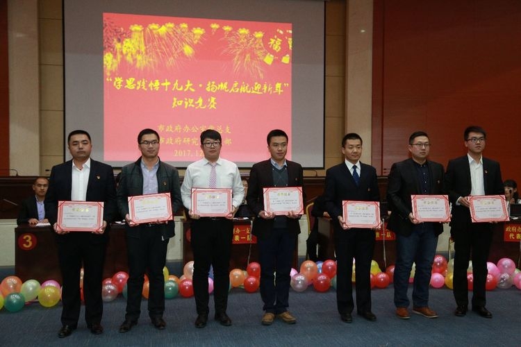 为深入推进“两学一做”学习教育常态化制度化,确保党的十九大精神及十九大修改后的《党章》在全体干部职工中入脑入心入行,在2018年新年来临之际,市政府办公室党总支部与市政府研究室党支部联合,于2017年12月29日组织开展了“学思践悟十九大?扬帆启航迎新年”主题知识竞赛。